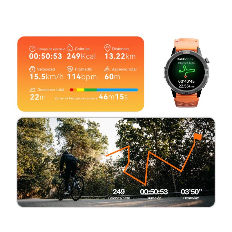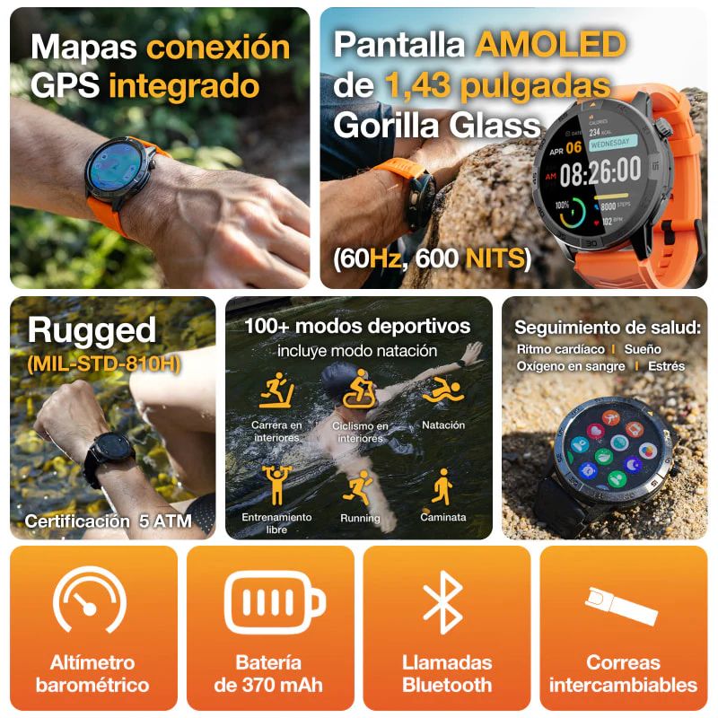 Un smartwatch diseñado para quienes buscan rendimiento, resistencia y estilo. Combina pantalla AMOLED, GPS integrado, más de 100 modos deportivos y certificación militar, todo en un solo dispositivo.